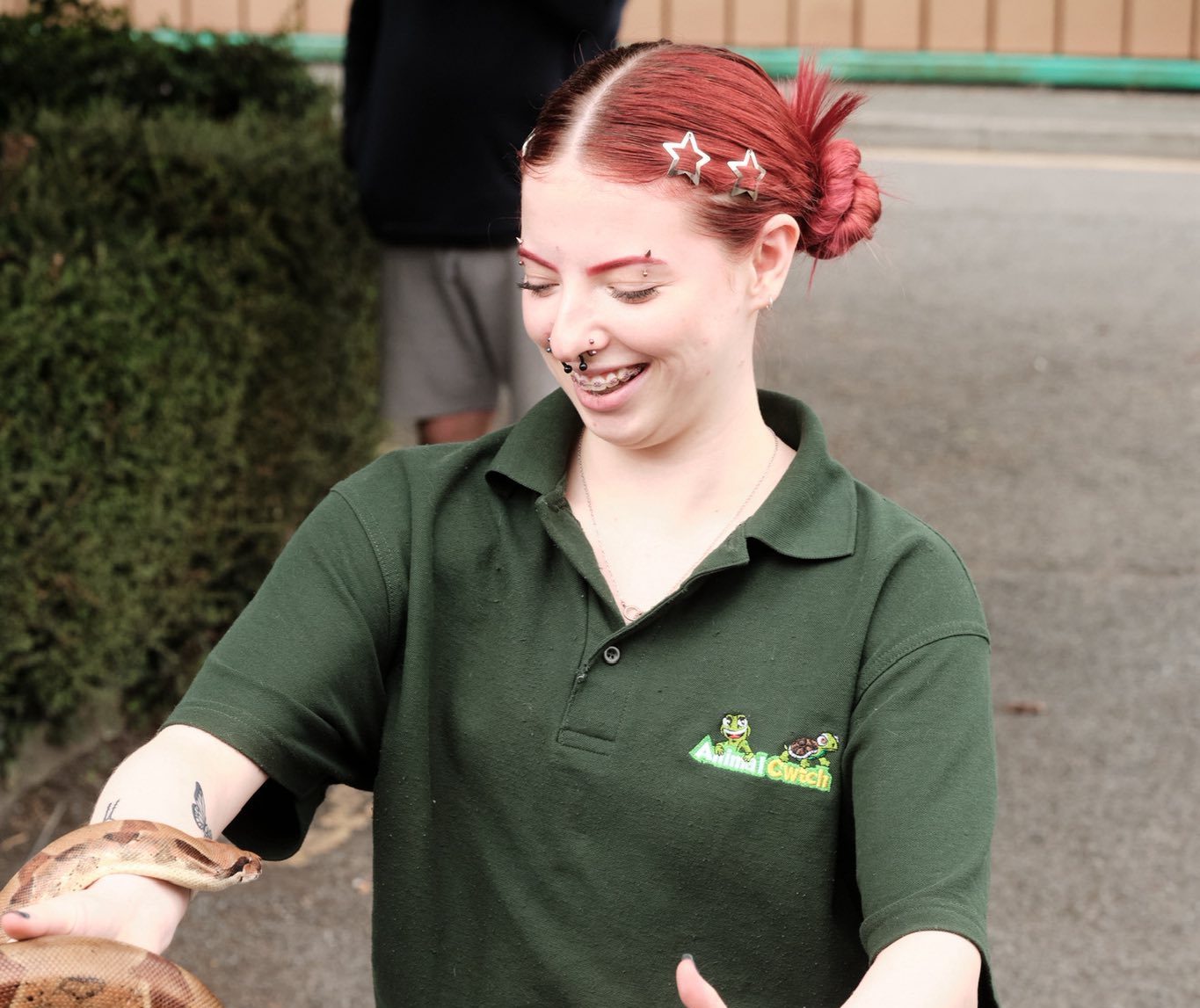 Sadie has a special connection with Boba the boa constrictor, though she’s brilliant with every animal she meets. Her calm confidence and gentle handling make her especially good at working with the more sensitive members of our Animal Cwtch family.