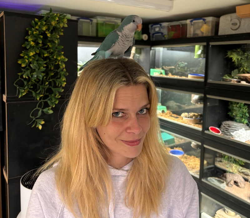 She once promised herself she wouldn’t take any animals home, but that promise didn’t last long! She’s now the proud owner of two birds and a hedgehog named Urchin. Her love of reptiles runs deep, and she’s even grown fond of spiders—despite keeping her distance when she first started.